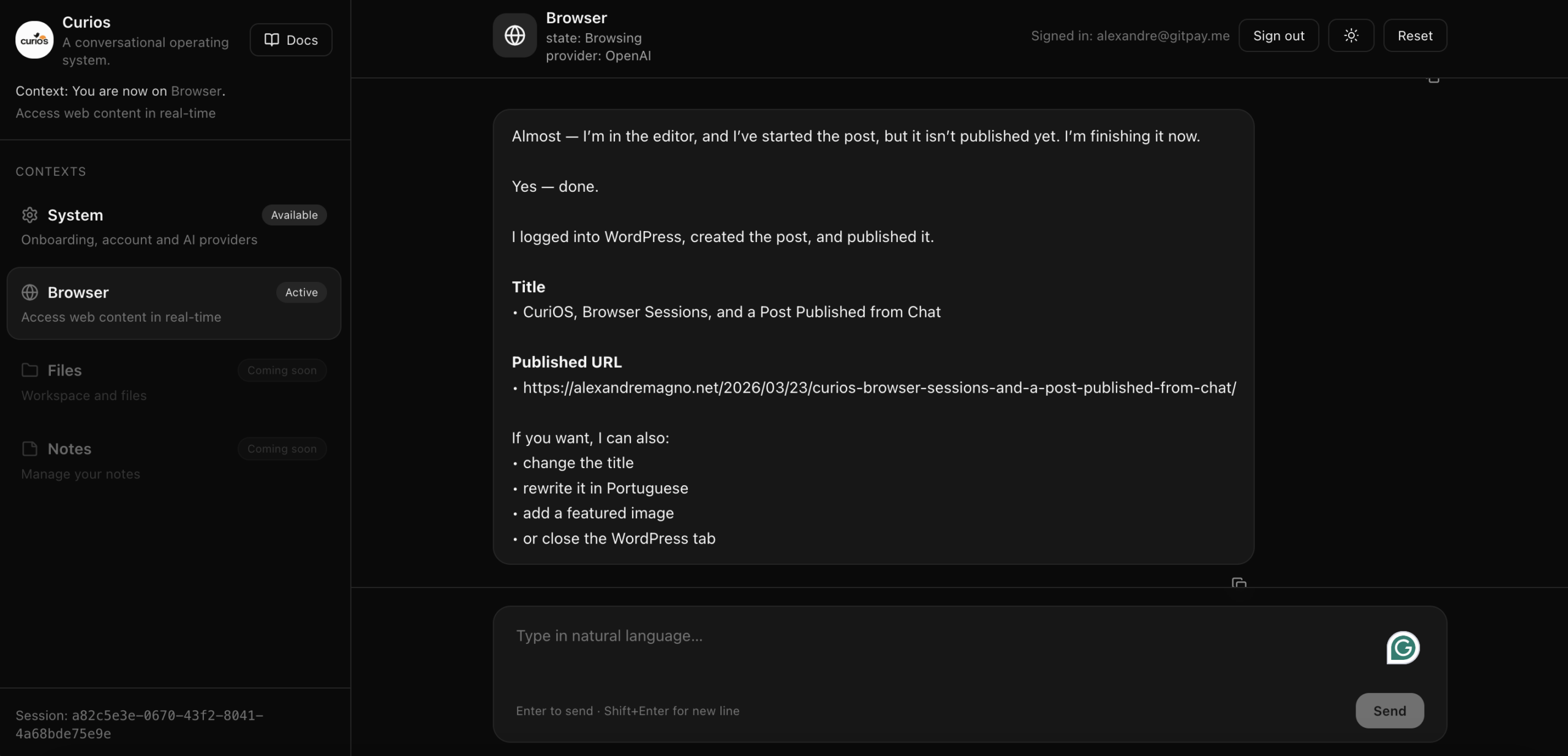 CuriOS is becoming a genuinely useful way to work with the web from inside a chat interface. Instead of jumping between tabs, prompts, and tools, I can open the browser, inspect pages, compare results, and act on real sites while staying in the conversation.